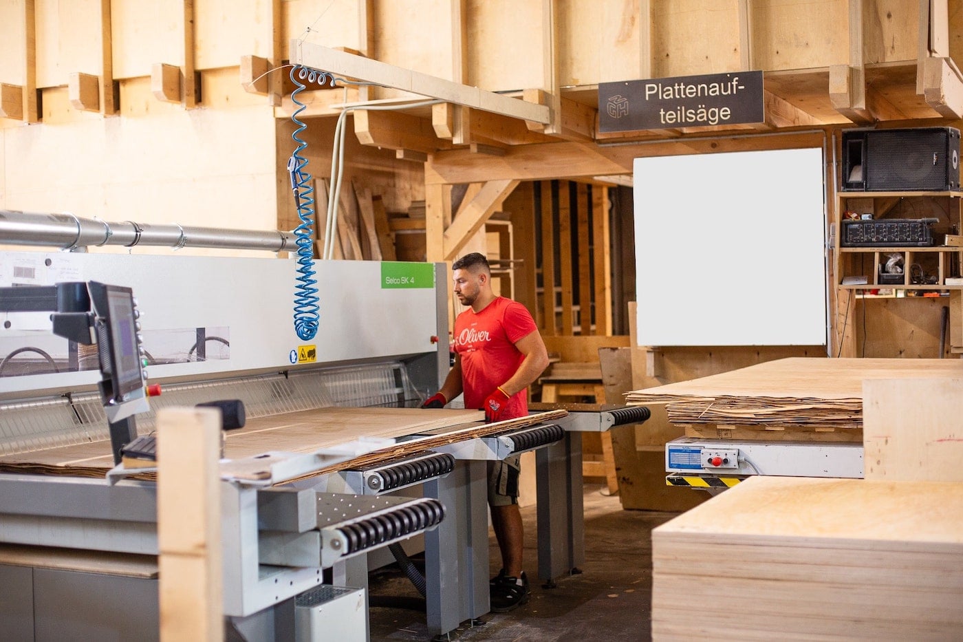 Am Ende entscheiden Milimeter. Deshalb schneiden wir unsere Holzwerkstoffe mit zwei Präzisionssägen exakt nach Ihrem Maßen zu. Das maximale Plattenformat von 5600 x 2600 mm kann nach Ihren Wünschen aufgetrennt werden.